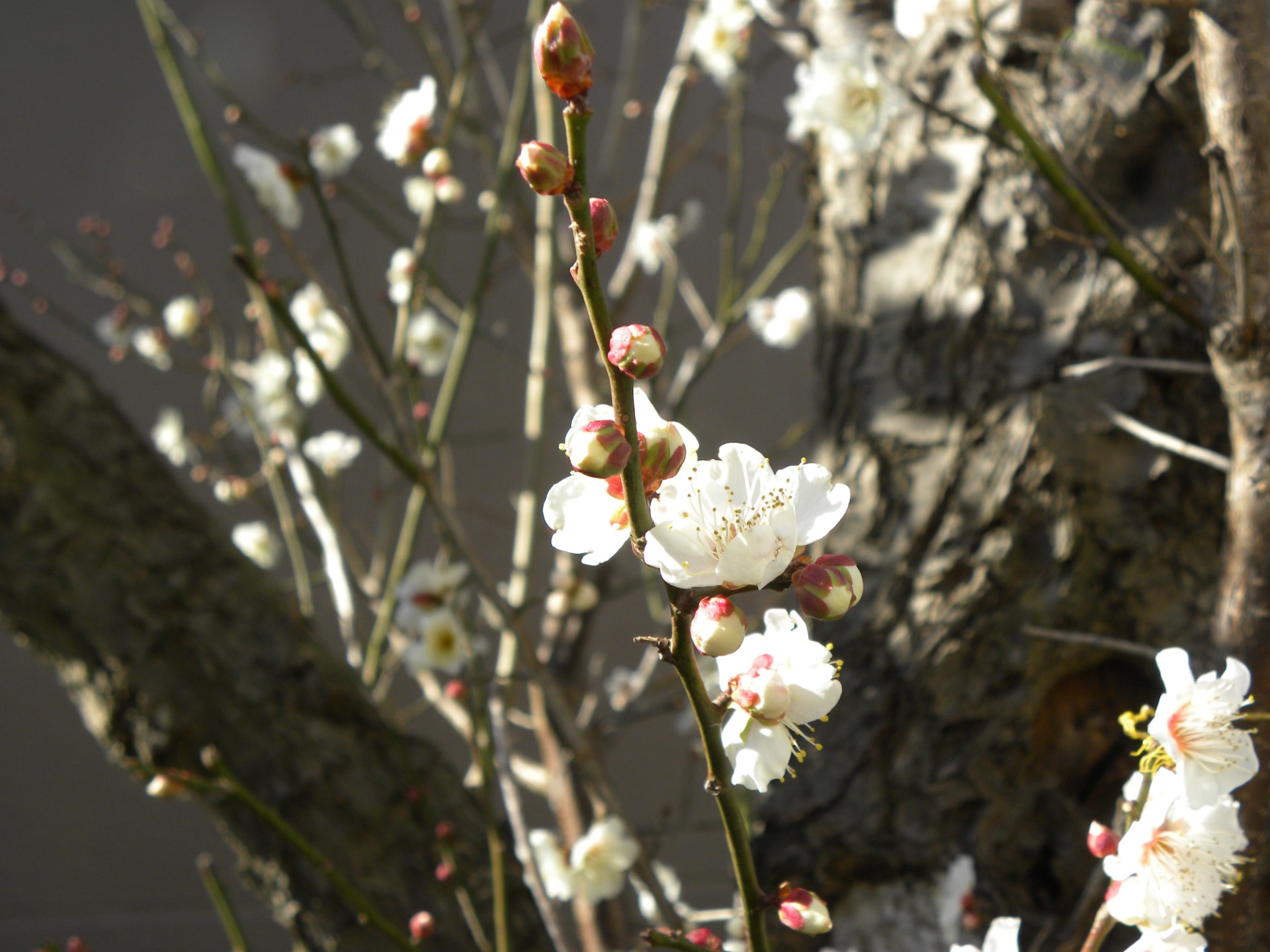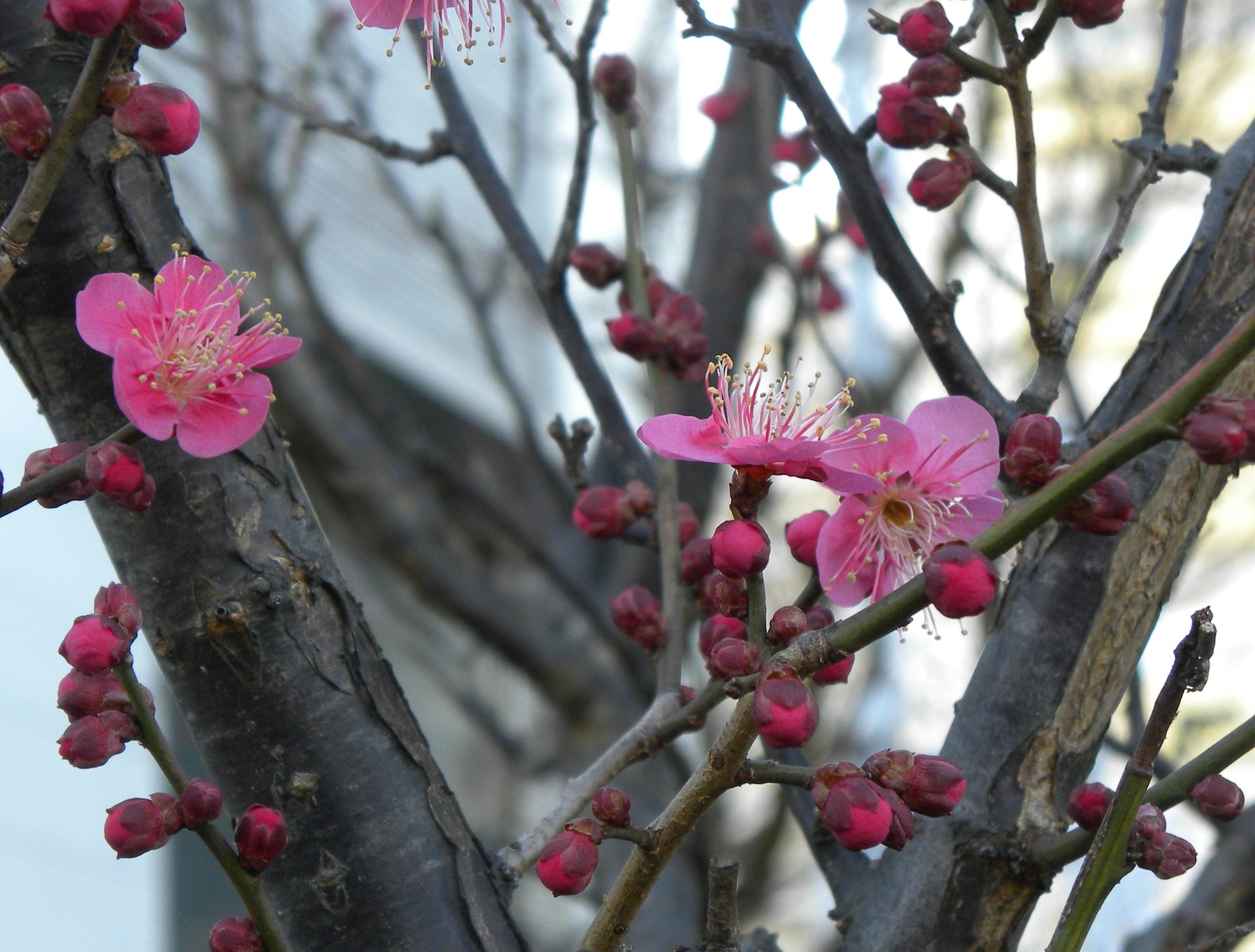 通り過ぎて、あれっと思って戻りました。紅梅が咲いています。まさに「ひっそり」と。桜とはまた違う、紅梅白梅の季節がやってきましたね。近くに梅園がありますが、こちらはまだまだ咲きそうにありません。