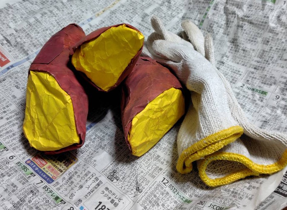 これは作り物の焼き芋。冬の時期「おはなし会」に登場します。軍手をはめて、「あちち、あ、あ、あ」なんて言って子どもに渡せば、ちゃんと熱いものを受け取ったリアクションをしてくれます。かわいいね。