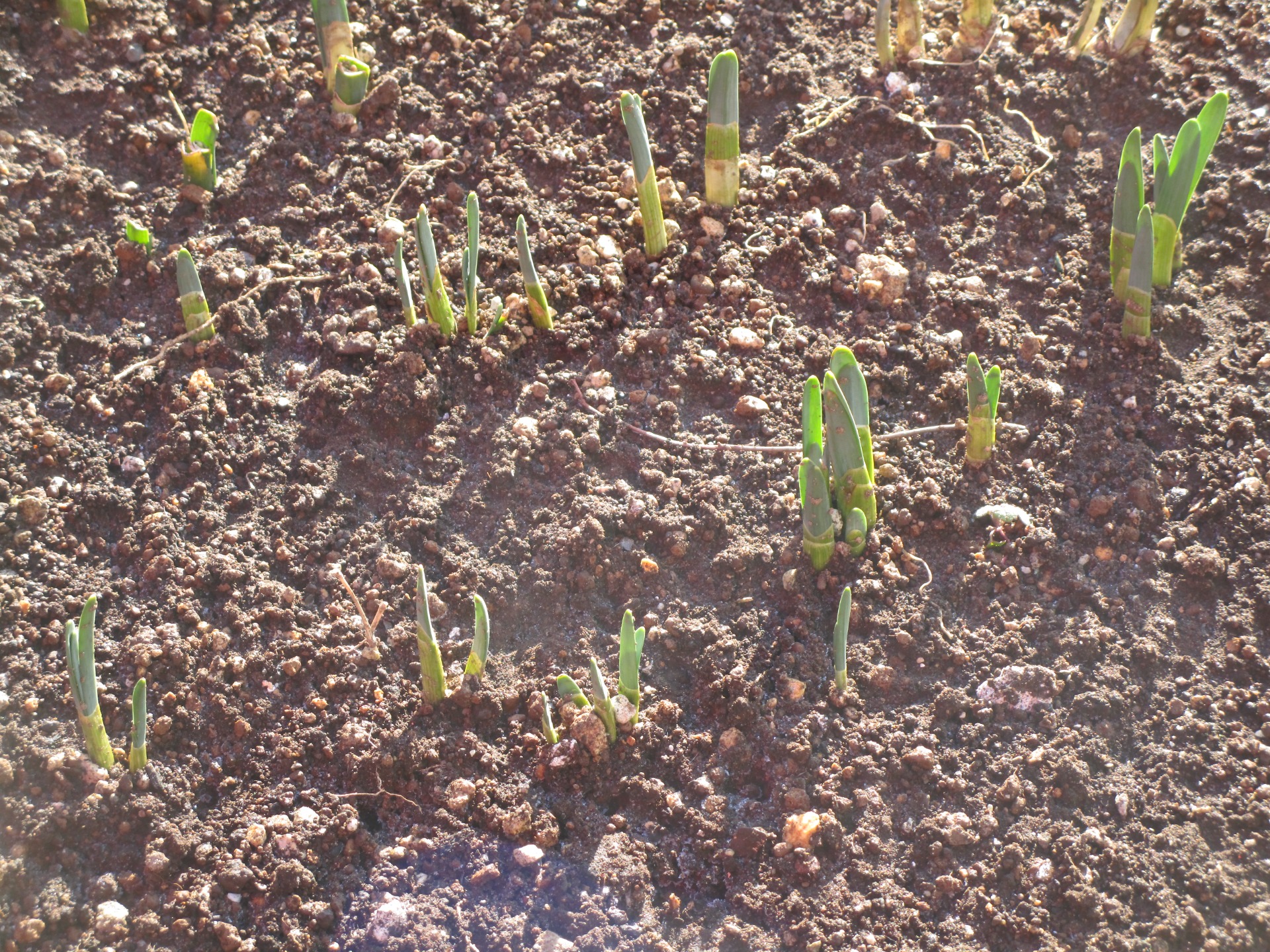 これはチューリップでしょうか、たくさん芽を出していました。「ここは日当たりがいいからね」とご近所さんらしいご婦人が言ってました。咲いたらきれいだろうけど、「今まさに」というこの状況もいいものです。