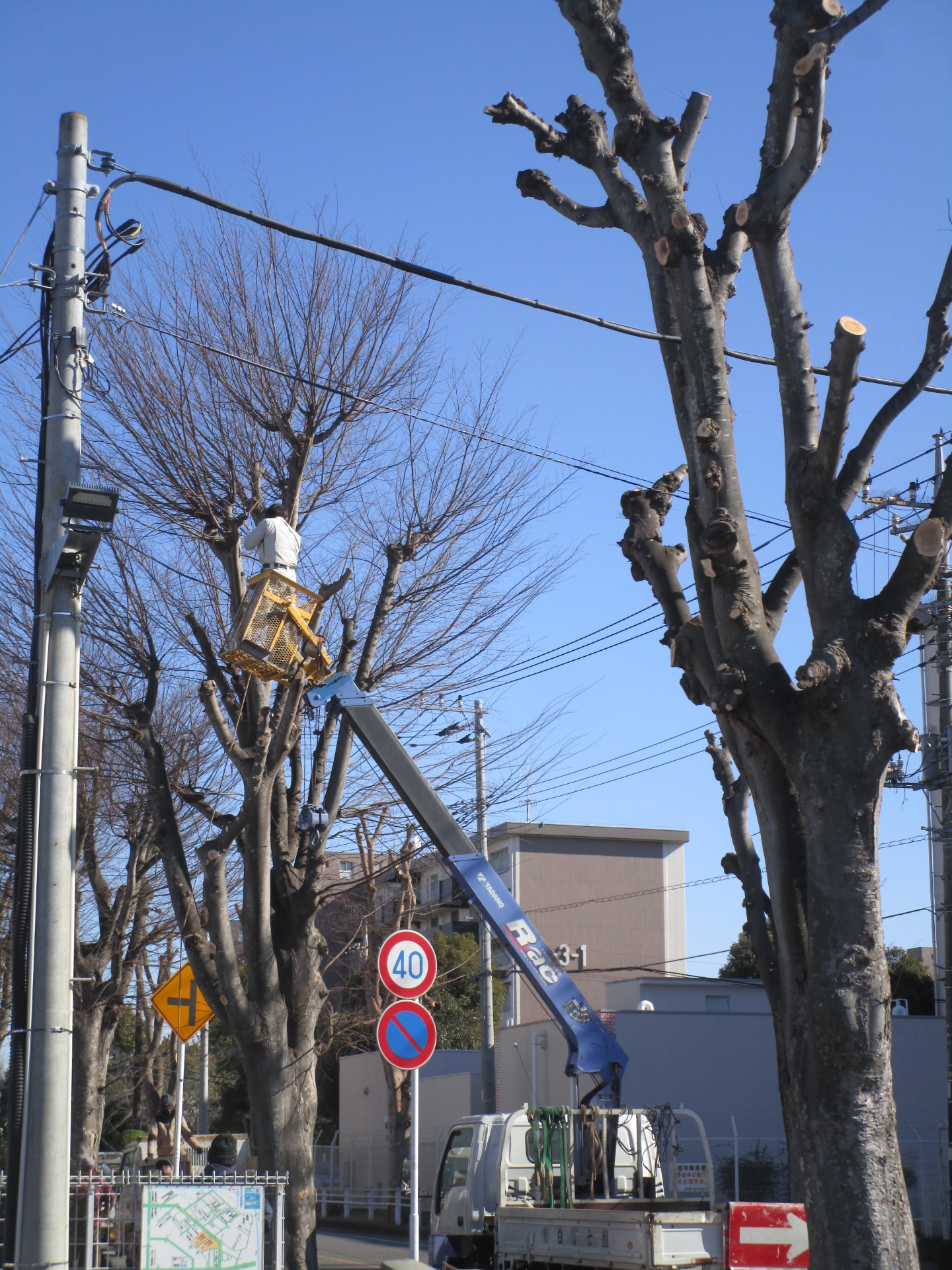 これぞ写真なしでは意味が通じません。剪定に適した時期なのでしょうか、街路樹が切り込まれていきます。上と下の連携が大切な作業ですが、聞こえてくるのは日本語ではないような。気持ちいい晴れ。