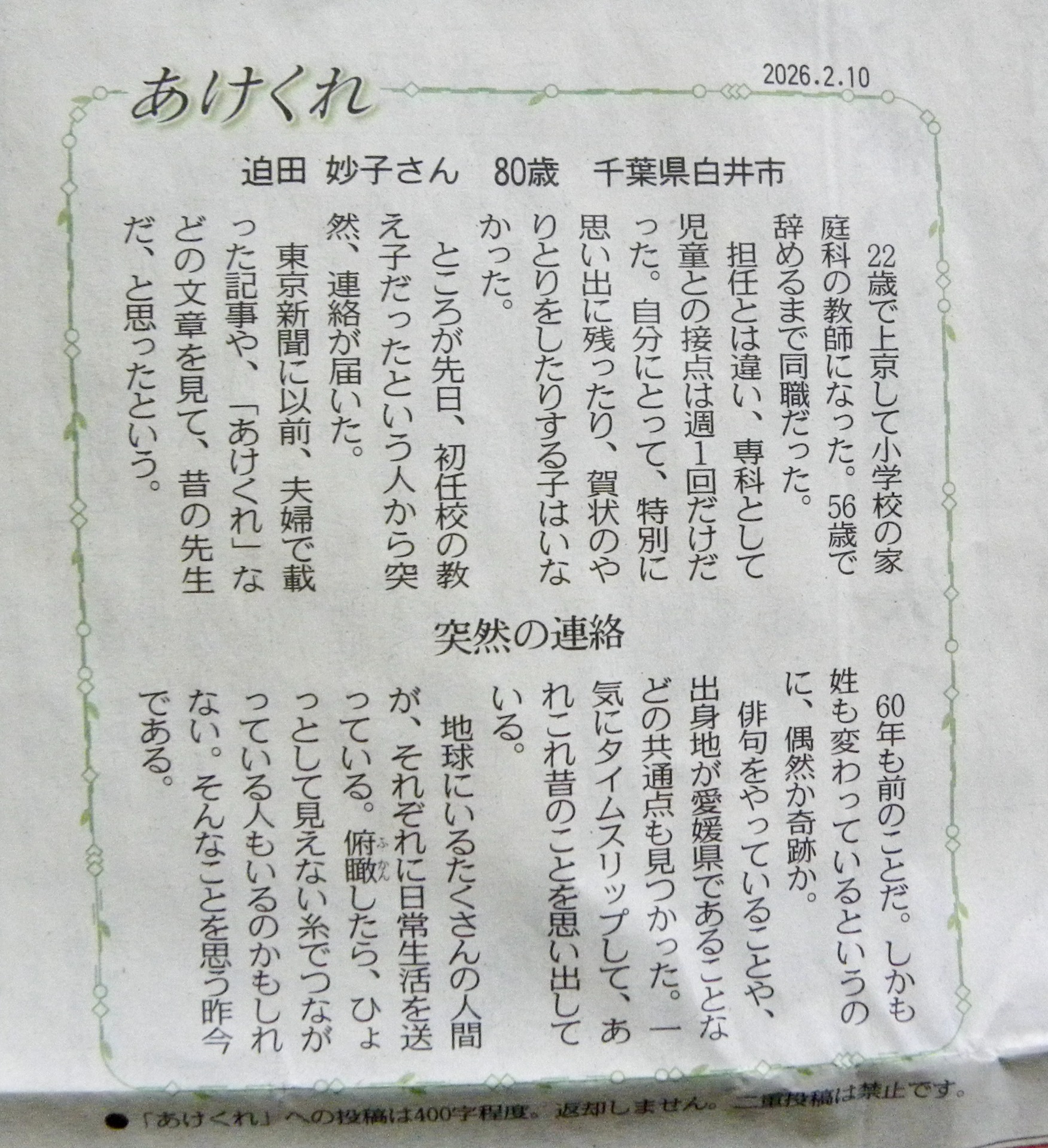 昨日2/10 東京新聞朝刊「あけくれ」欄に掲載されました。本当に不思議な体験をしたので、記録・記念として。心情にぴったりな空の写真を添えます。縦糸と横糸のような。(そんな歌がありましたね)*お便り参照