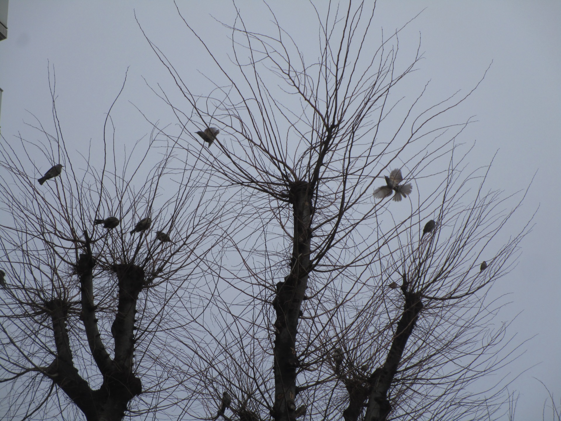 雨あがりの枝に鳥群れて。多分ヒヨドリ。ボランテア仲間にめっぽう鳥に詳しい人がいます。尾が特徴のこの鳥は。空中で飛んでいるのも捉えました。枝、毛細血管のように見え、線描画と表しました。@白井駅前広場