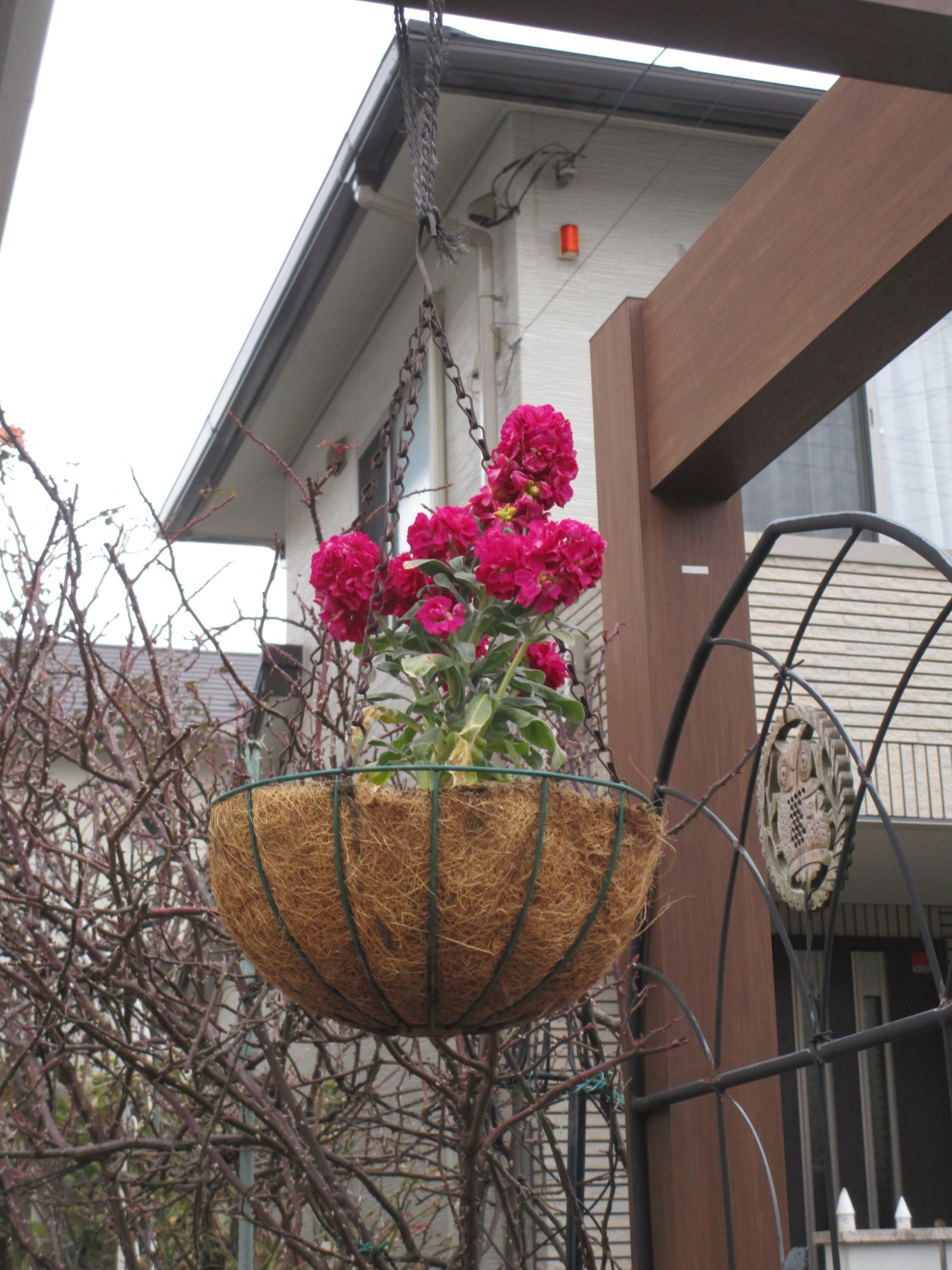 誰かさんちの庭。ハンギングの花がいろいろ。今はストックのいい香り。そんな空気の中で、ワンちゃんはゆっくりお昼寝。ワンちゃんが駆け回れるほどの広いお庭だったらいいのにね、という空想。