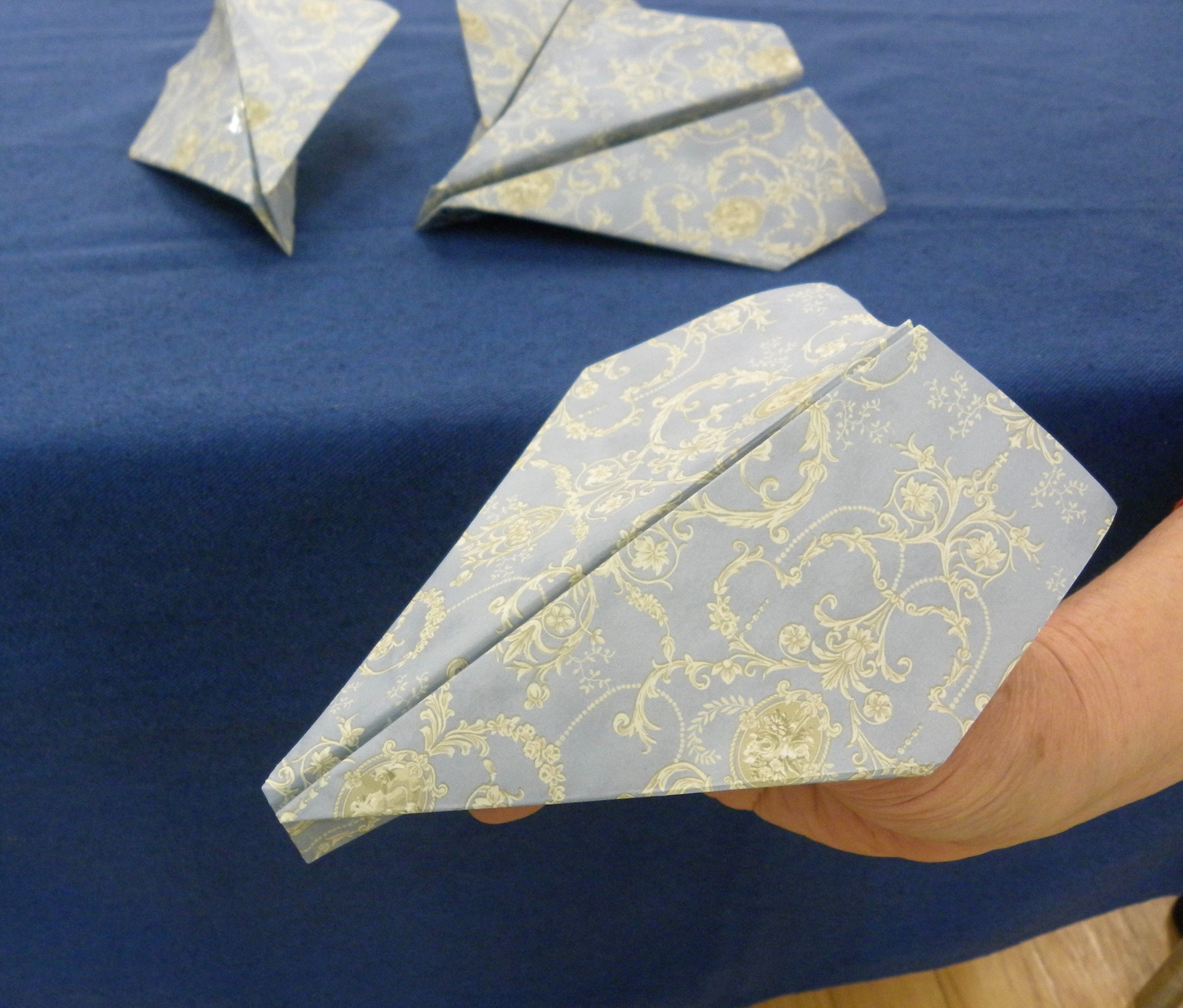 土曜日におはなし会をしました。今回のお土産は紙飛行機。渋い色合い。よく飛ぶ特別の折り方のようです。外でできればよかったのですが、春の日が差し込む室内で飛ばしてみました。大人も子どもも楽しそう。