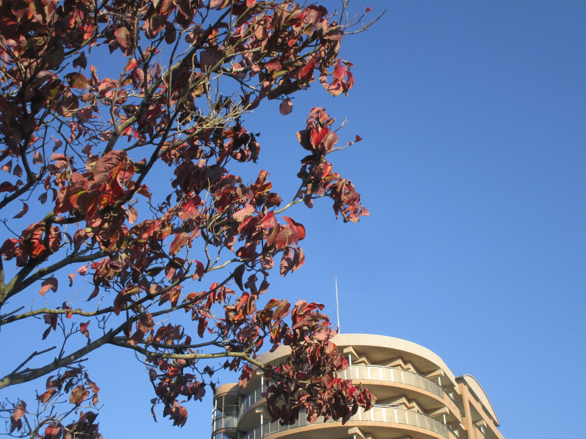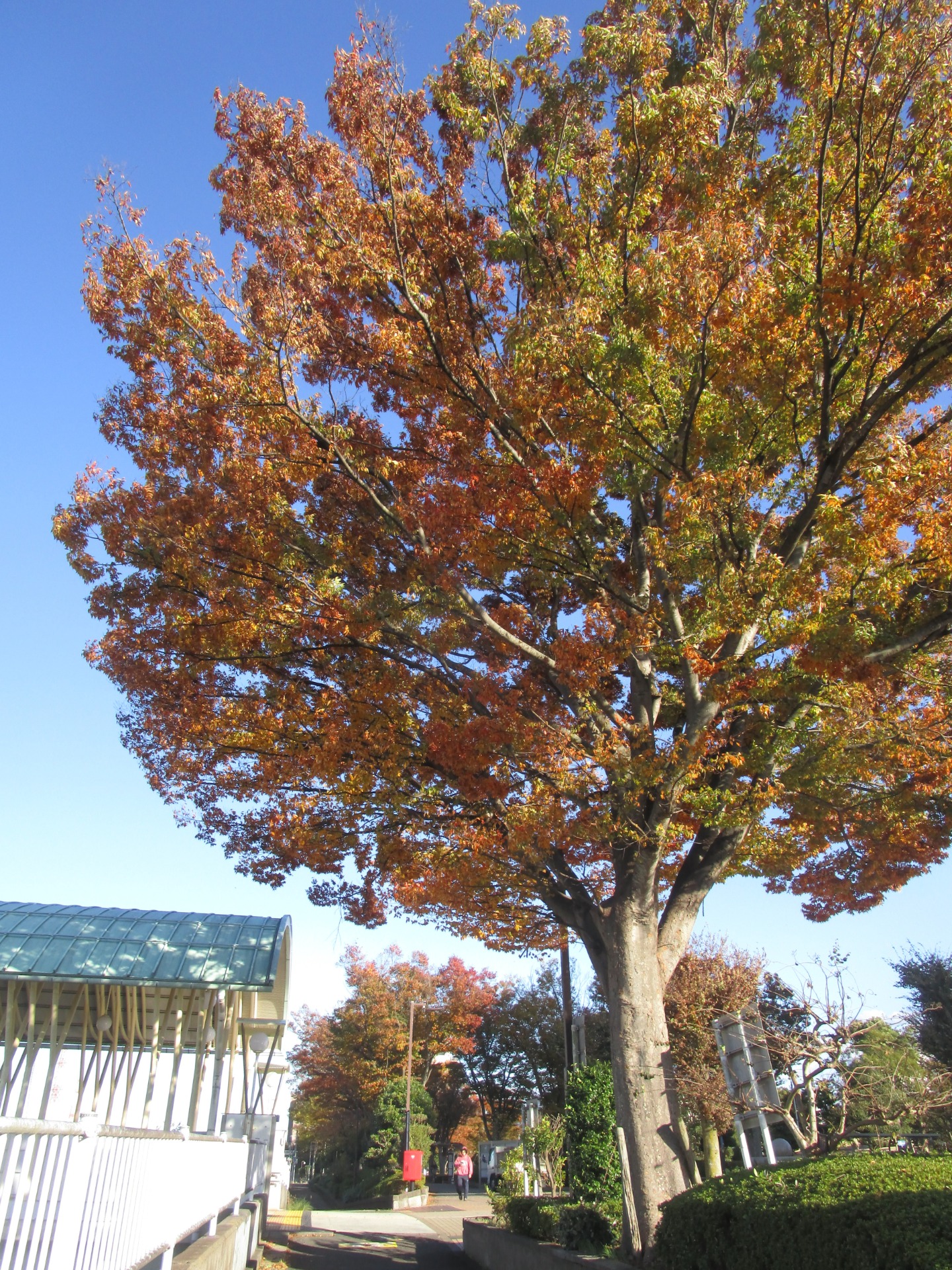 住んでいる白井の駅前、シンボルツリーのような存在です。青空に映えています。紅葉は秋を表しますが、このところの寒さは正に「冬来る」か。景のポイントになる赤いポストもお見逃しなく。