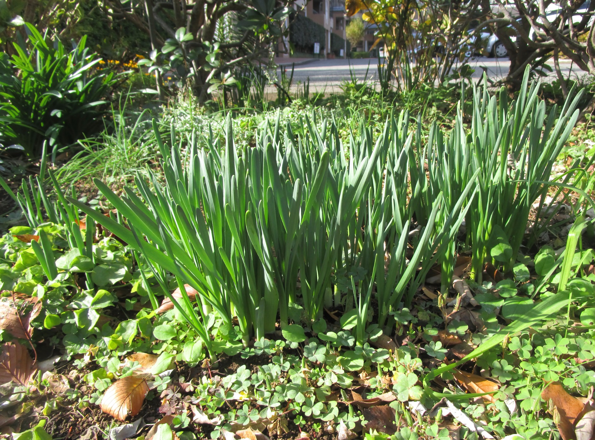 寒さの中、伸び伸びと葉を伸ばしているのは、水仙です。冬の季語「水仙」なので近いうちに蕾が見え、やがて可愛らしい花を咲かせることでしょう。空に向かって伸びる葉に元気をもらいました。