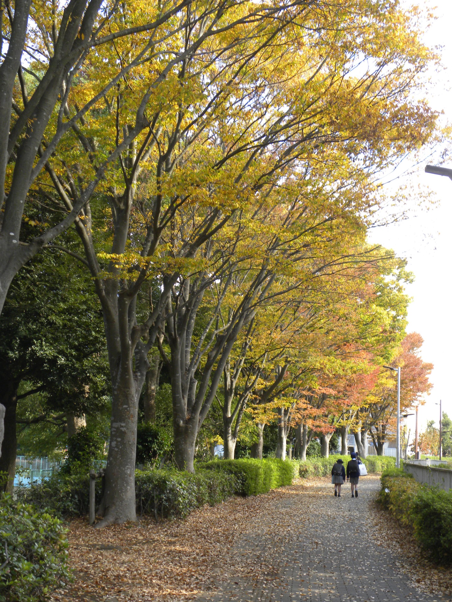 「錦秋」という言葉がよく似合う並木道。仲のいい友だちとの帰り道。絵のような風景の中では、足取りも軽くなりますね。今が一番いい季節かもしれません。