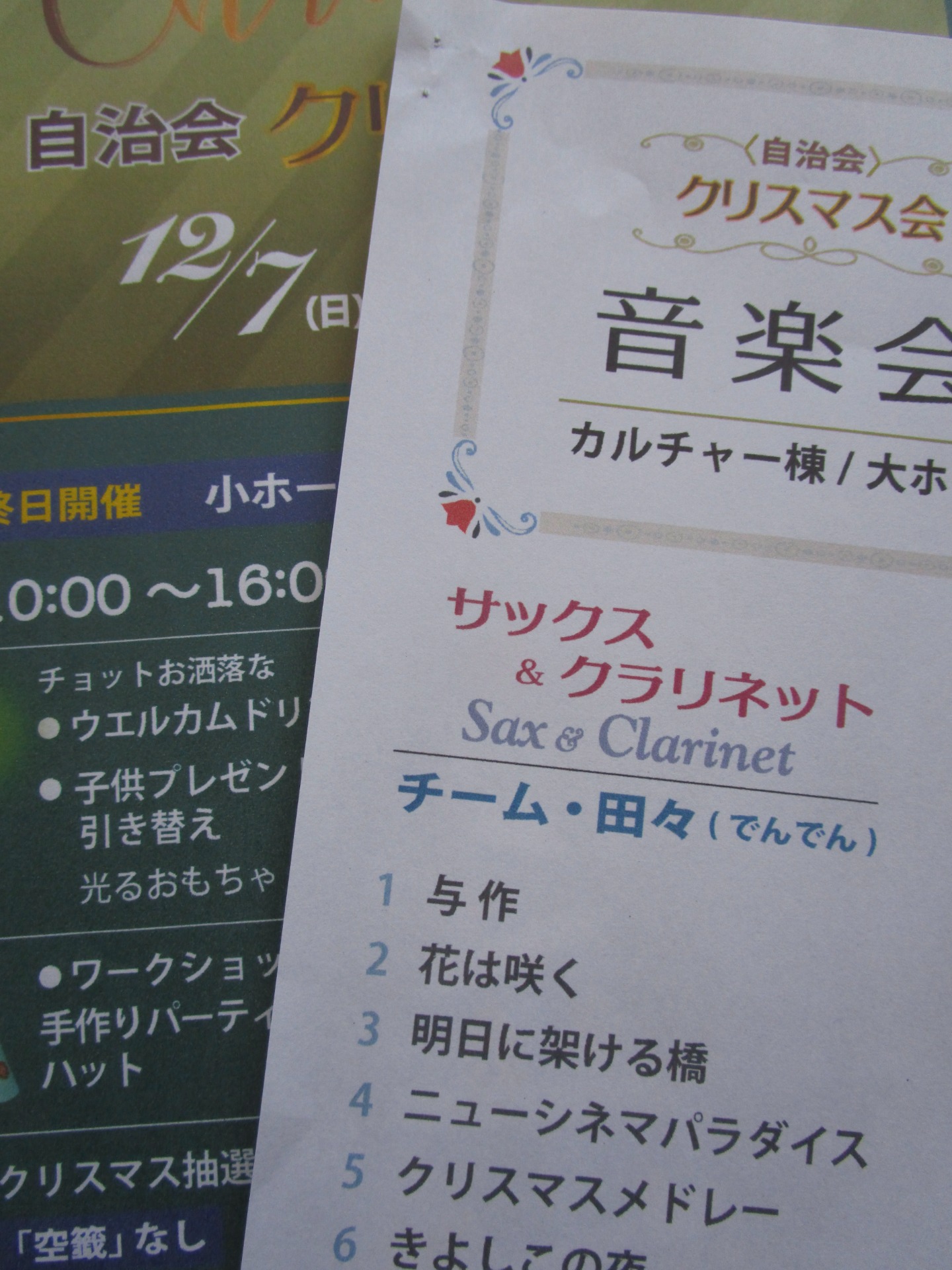 自治会のクリスマス会に出演します。「田々」というチーム名でサックスと共演します。ポスターやプログラムも張り出され、「やるしかない」の心境。何よりも自分たち自身が楽しんで演奏したいと思います。