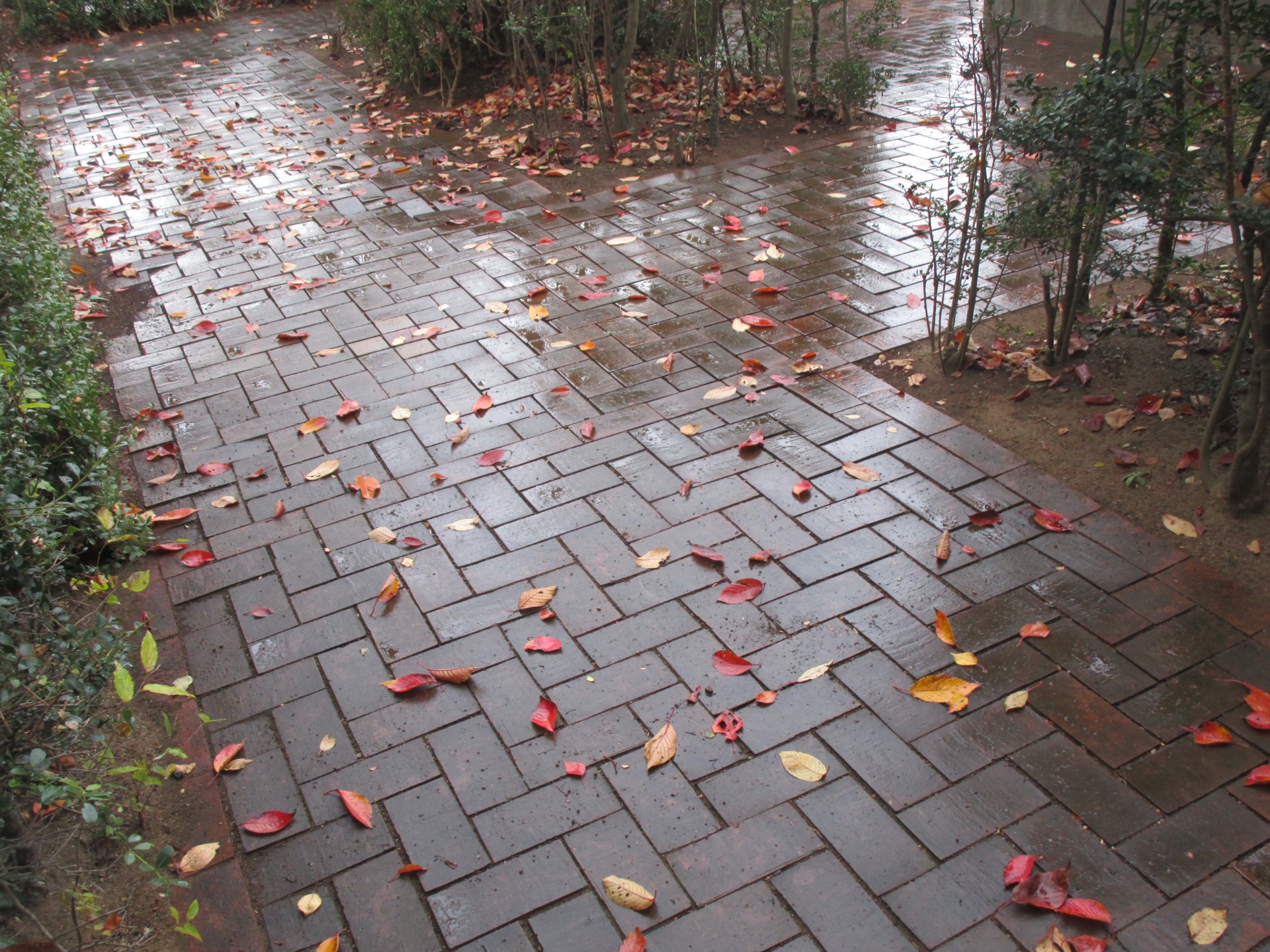 今朝はよく晴れていますが、昨日は寒い雨の日でした。雨の日だからこそ撮れる写真が、撮りたいなあとキョロキョロ歩いていました。雨に濡れた歩道、雨で輝いていました。石畳とは違う足に優しい木のタイルかな。
