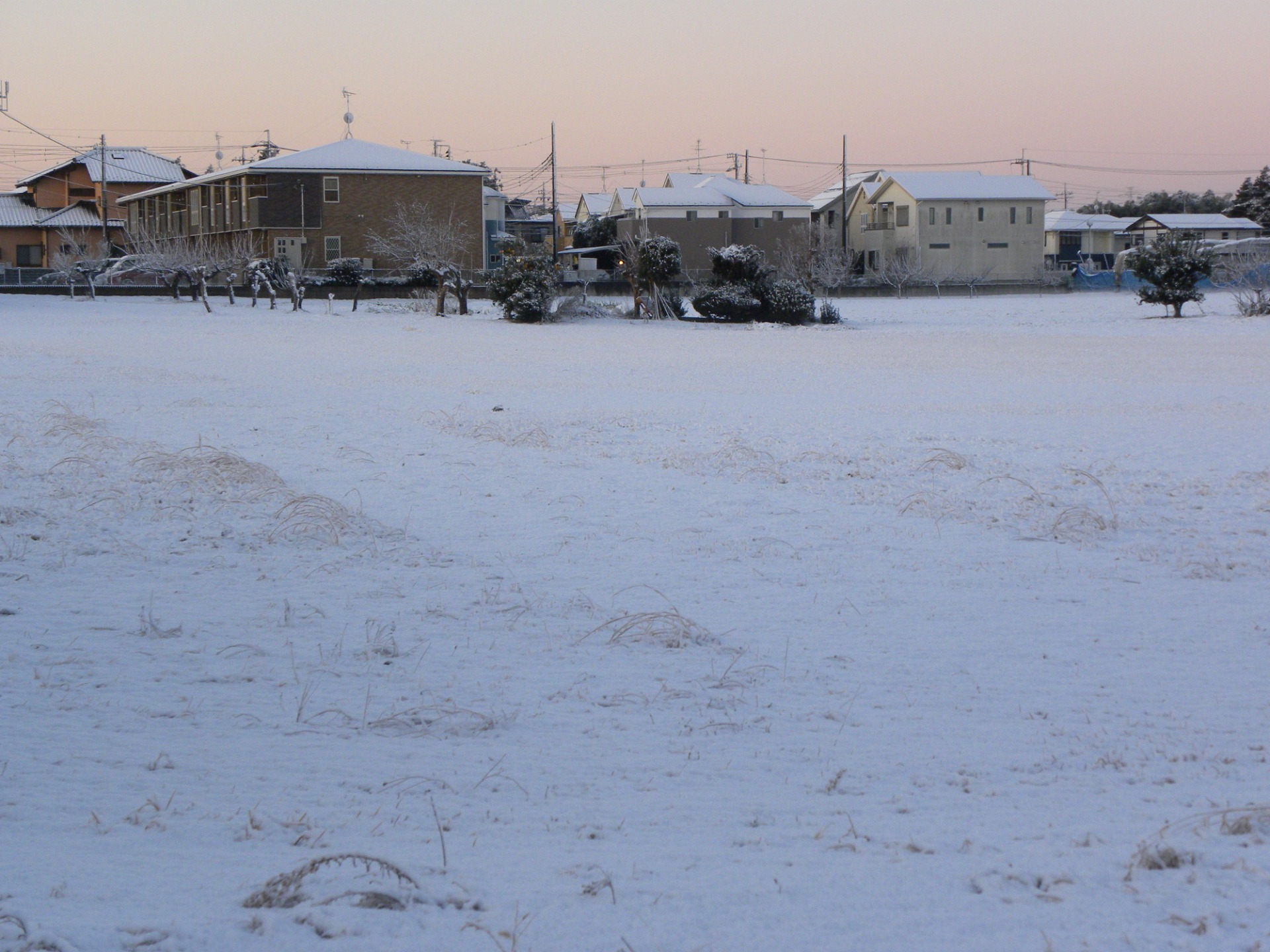 前夜から降り出していたそうですが、気づかず、3日朝カーテンを開けてびっくり。空が朝焼けで染まる寒い時間に、カメラ持って飛び出していました。雪国育ちで雪なんか珍しくないのにね。記録として。