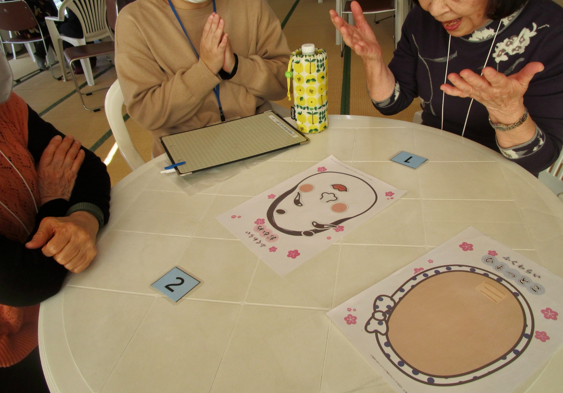 今年初のシニアサロン。おかめ、ひょっとこの福笑いをしました。目隠しを取るたびに、歓声が上がります。昔からのお正月の遊び。その後のお喋りにも花が咲き、楽しい時間でした。