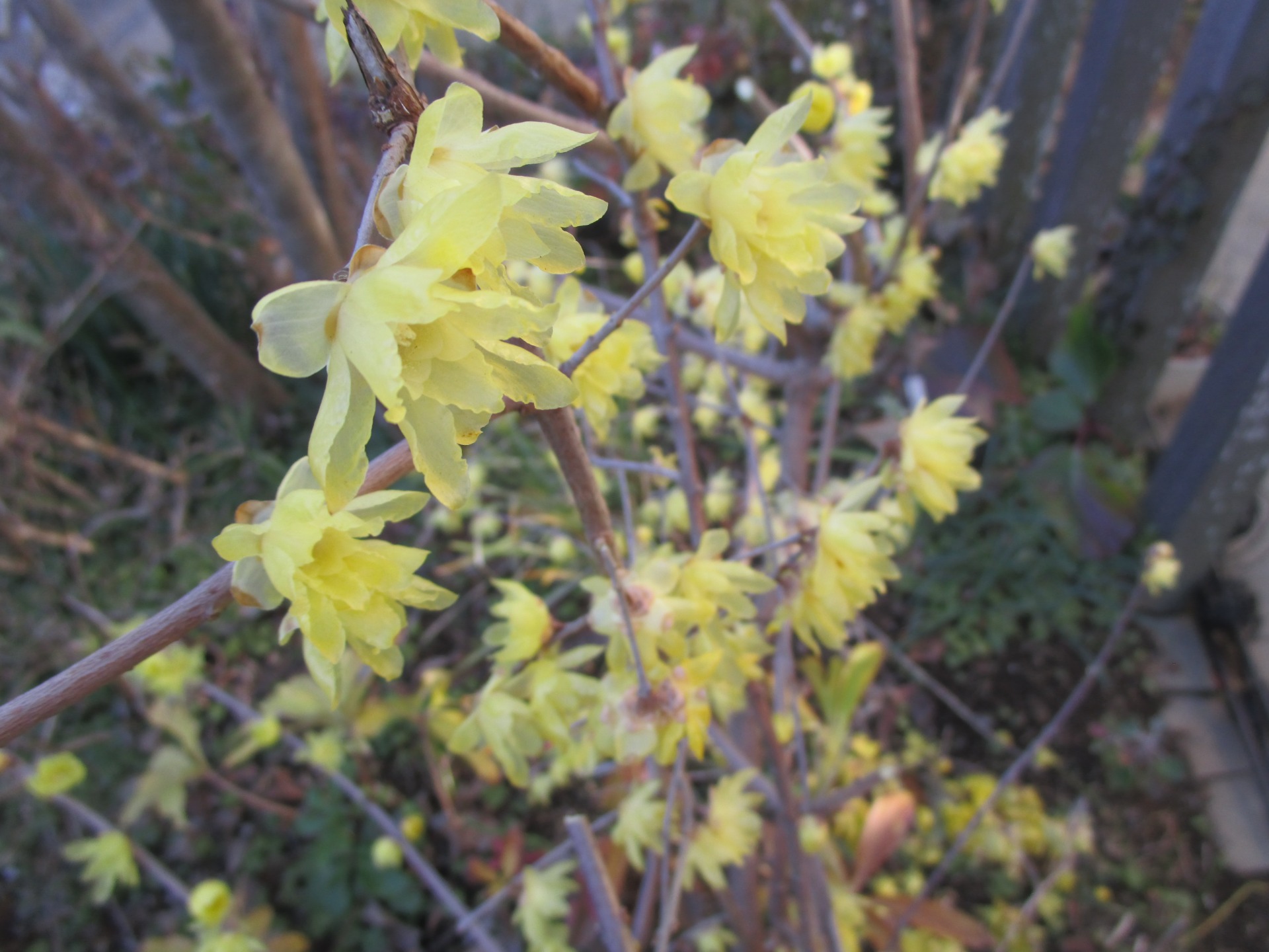蝋梅が咲いている情報は入ってきていたのですが、昨日思いもよらぬところで、見ることができました。この香、薄い花びら、色、毎回蝋細工のような姿にみとれます。一年の巡り、早い早い。