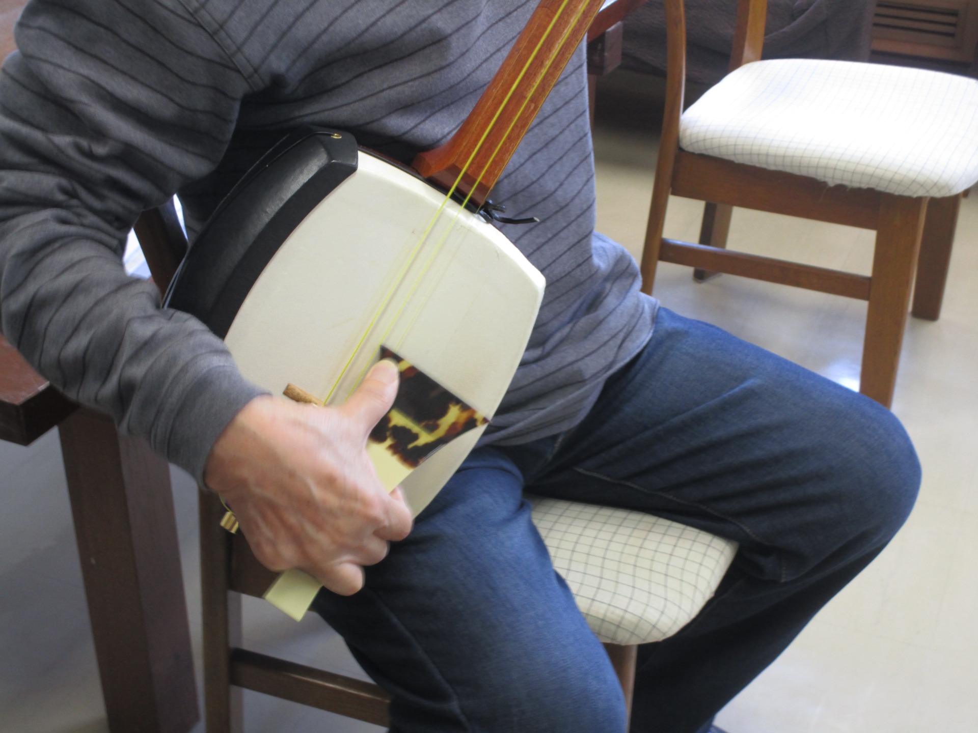 マンション住人でトリオ結成。その中の三味線を弾く男性は、練習にちゃんちゃんこを着て現れました。(画像は脱いでいますが)それがまたよくお似合いで、いい雰囲気なのです。トリオ演奏、いつお披露目できるかな。